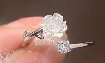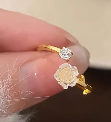 Inspired by the timeless beauty of the camellia flower, this adjustable silvery-tone ring captures elegance in bloom. A sculpted white camellia rests gently atop the band, flanked by delicate leaves that wrap the finger in botanical charm. The soft shimmer of the silver finish adds a modern touch to its vintage soul.